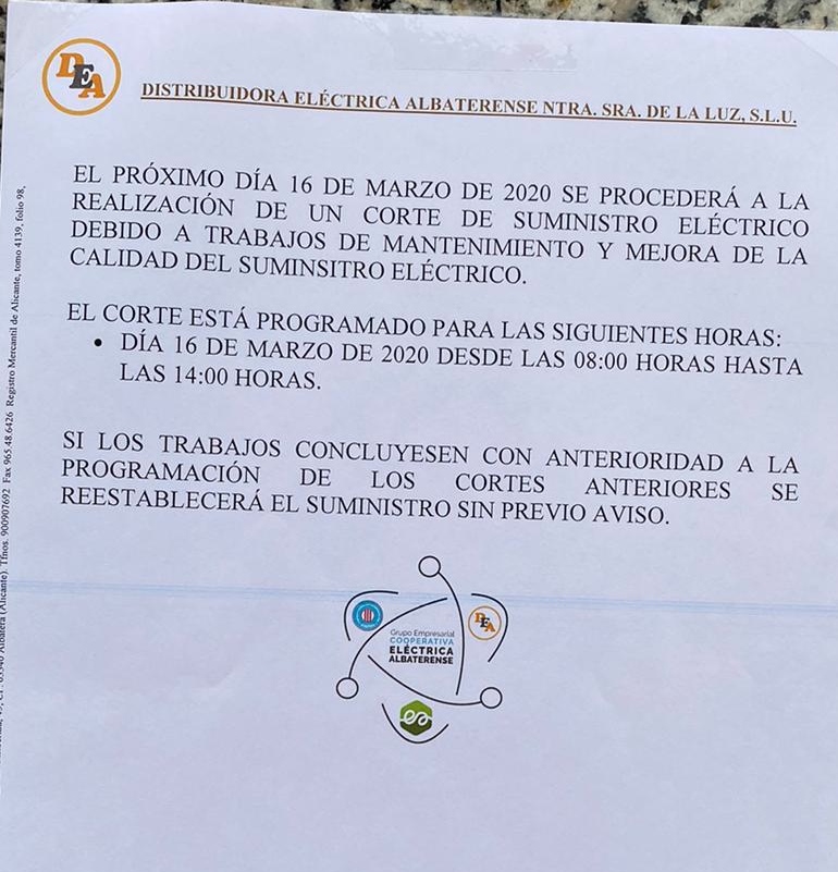 El Consejo Rector de la Cooperativa Eléctrica Benéfica Albaterense informa que las oficinas de la Cooperativa Eléctrica Benéfica Albaterense estarán