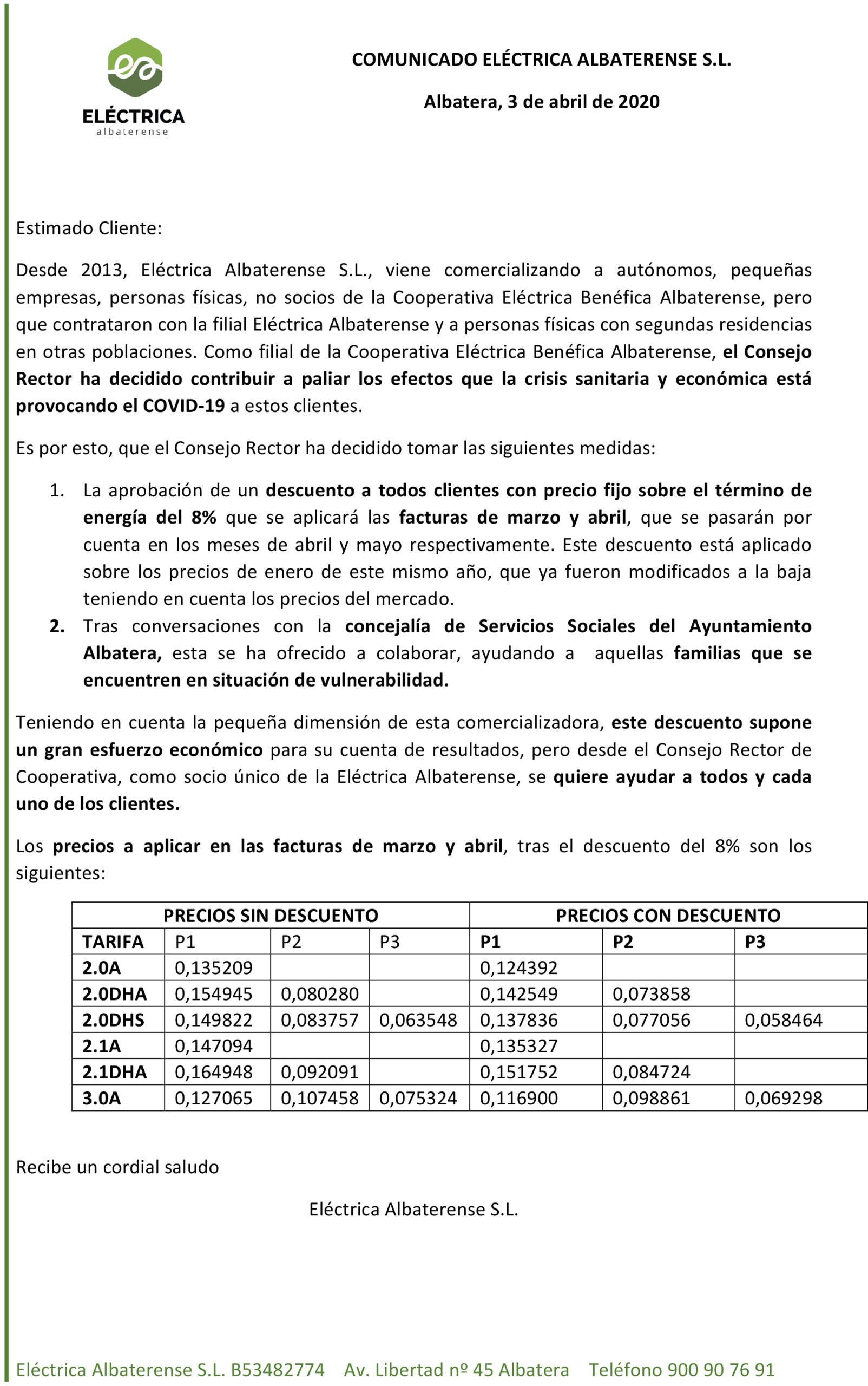 El Consejo Rector de la Cooperativa Eléctrica Benéfica Albaterense aprobó el pasado 7 de julio, mantener un 10% de descuento
