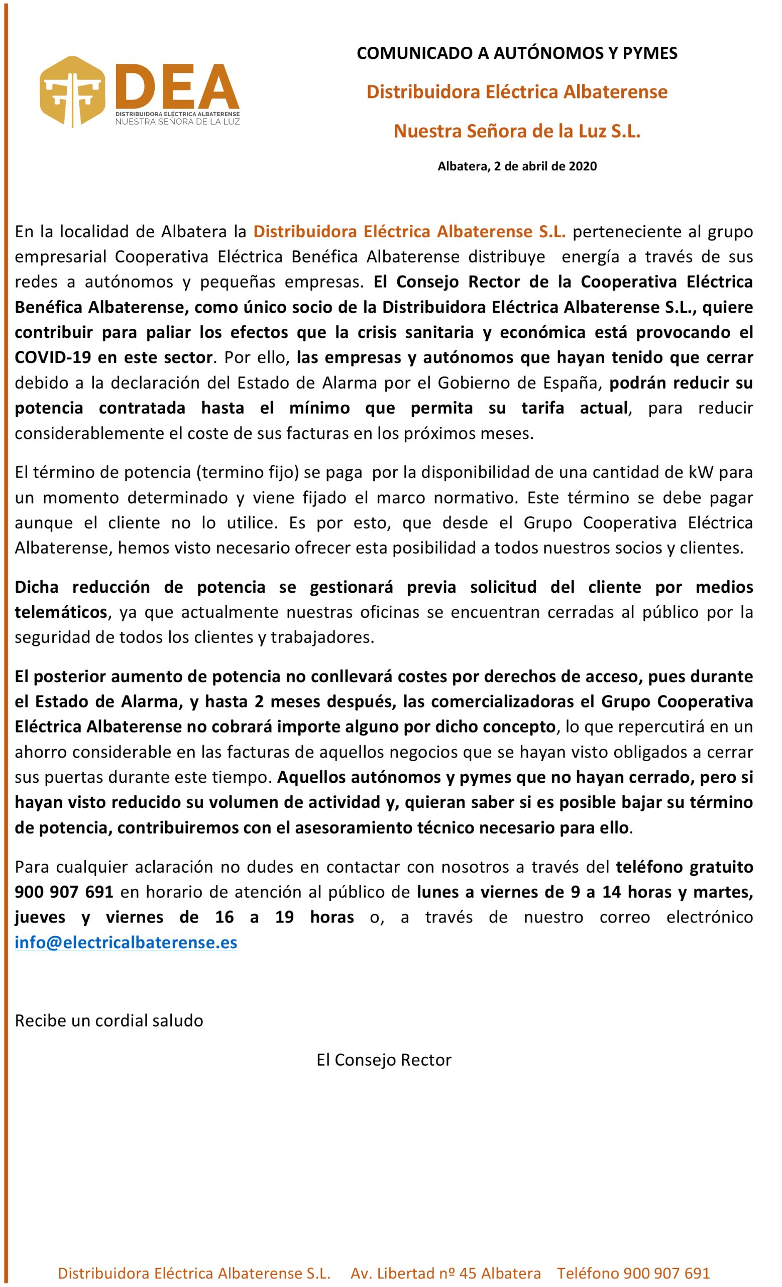 En la localidad de Albatera la Distribuidora Eléctrica Albaterense S.L. perteneciente al grupo empresarial Cooperativa Eléctrica Benéfica Albaterense distribuye energía a través de sus redes a autónomos y pequeñas empresas. El Consejo Rector de la Cooperativa Eléctrica Benéfica Albaterense, como único socio de la Distribuidora Eléctrica Albaterense S.L., quiere contribuir para paliar los efectos que la crisis sanitaria y económica está provocando el COVID-19 en este sector. Por ello, las empresas y autónomos que hayan tenido que cerrar debido a la declaración del Estado de Alarma por el Gobierno de España, podrán reducir su potencia contratada hasta el mínimo que permita su tarifa actual, para reducir considerablemente el coste de sus facturas en los próximos meses.