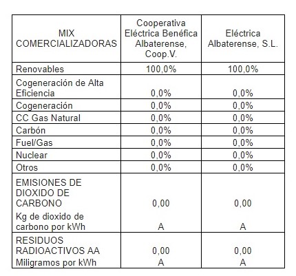 La energía comercializada en el año 2017, tanto en la Cooperativa Eléctrica Albaterense como en la Eléctrica Albaterense, es 100% renovable, sin emisiones de CO2 ni residuos radioactivos. Gracias a esto, la energía que comercializa la Cooperativa Eléctrica Albaterense no contamina, respetando el medio ambiente. La Comisión Nacional de Mercados y Competencia (CNMC) certifica, en su página web, el origen de la electricidad que suministran las comercializadoras en nuestro país, clasificando el impacto medioambiental. En la tabla que podéis ver a continuación se muestra el origen de la electricidad de las comercializadoras de Albatera.