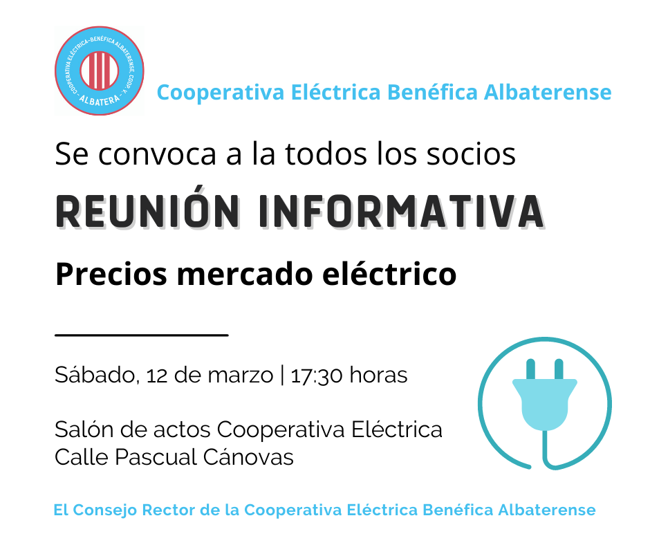 El Consejo Rector de la Cooperativa Eléctrica Benéfica Albaterense convoca a todos sus socios a una reunión informativa dada la escalada de precios en la factura de la luz que se está dando ante la crisis energética.
