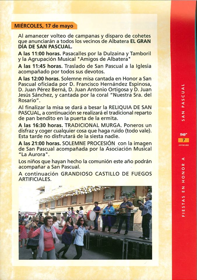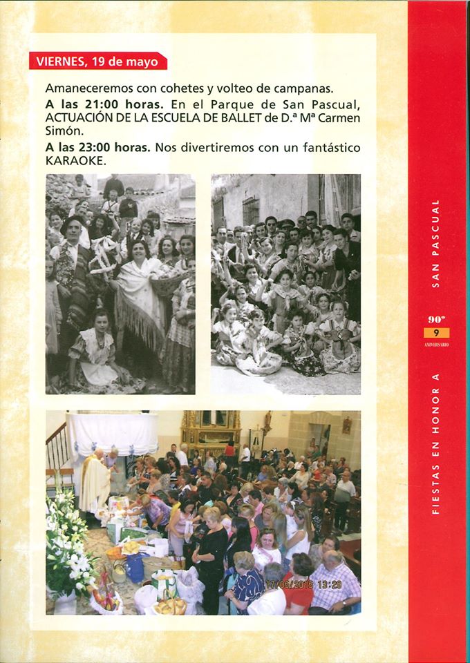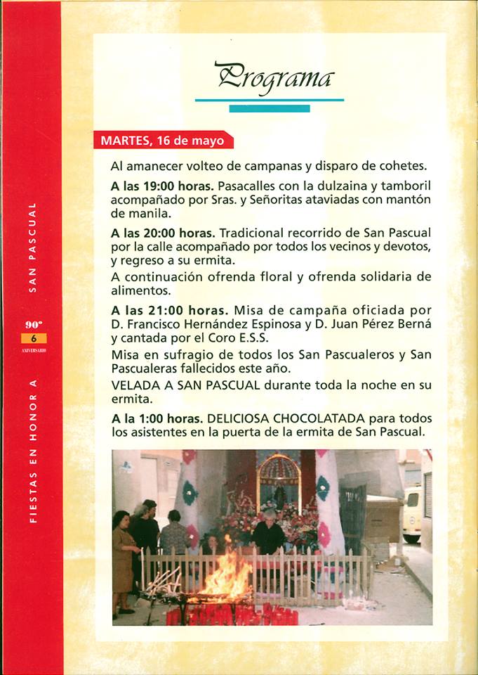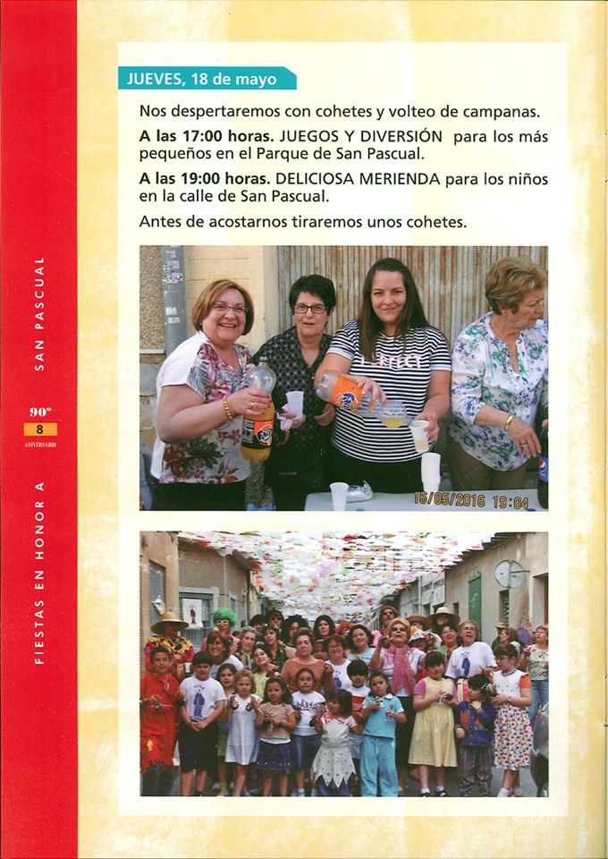 Este año la calle San Pascual celebra el 90 aniversario de su fiesta y qué mejor manera de honrar al santo que con seis días de festejos. La comisión de fiestas ha preparado eventos que comenzarán el 16 de mayo hasta el sábado 20. A continuación os dejamos unas imágenes del programa de fiestas de San Pascual.