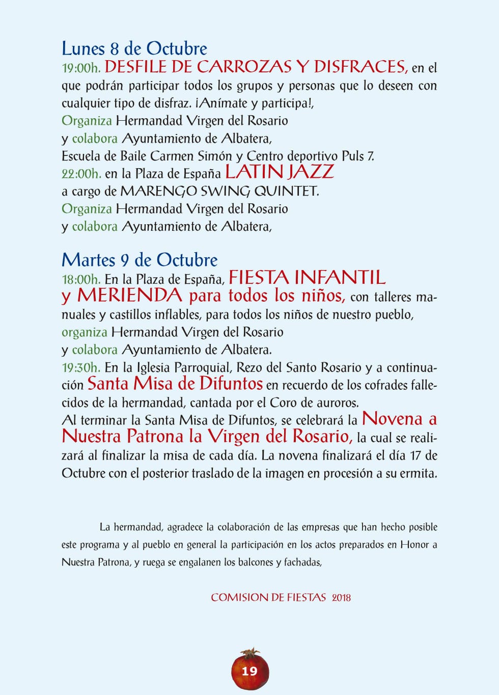 Un año más la Cooperativa Eléctrica Benéfica Albaterense colabora con la organización de las fiestas de la patrona de Albatera, la Virgen del Rosario. A continuación os dejamos la programación completa para que disfrutes de todos los actos que se desarrollarán durante los próximos días. Del 29 de septiembre hasta el 9 de octubre, acompáñanos en estas bonitas fiestas.