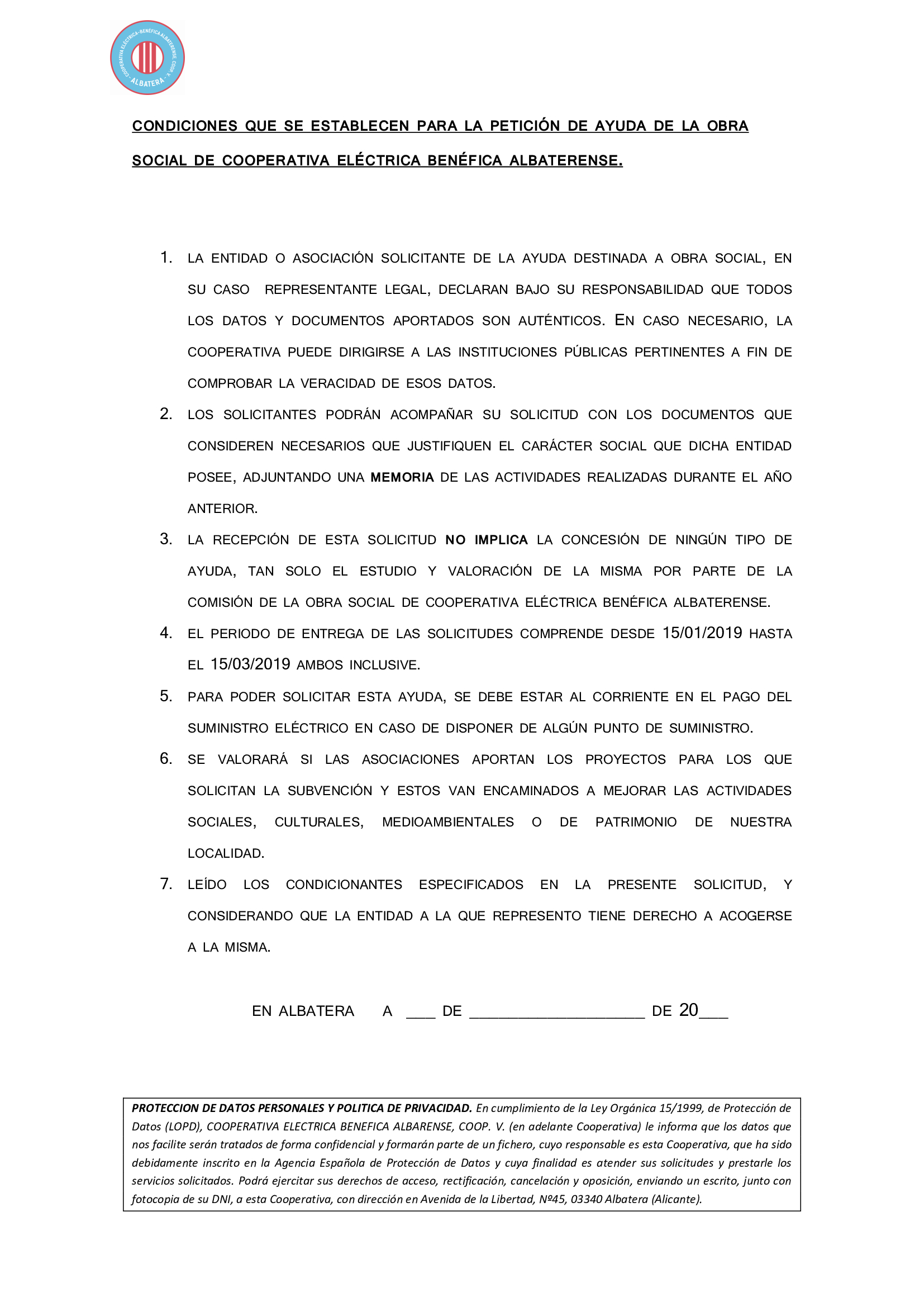 Para ello, las asociaciones interesadas en poder optar a esta ayuda deben presentar en las oficinas de la Cooperativa Eléctrica Benéfica Albaterense sus proyectos para el 2020 junto al impreso de solicitud.