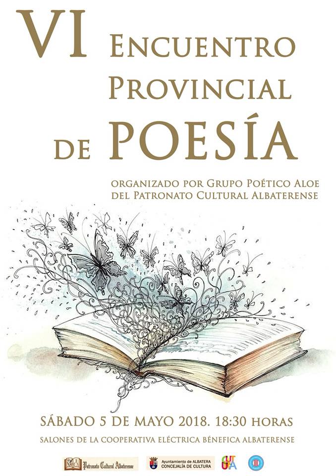 En esta sexta edición, en la que colabora en su organización la Obra Social de la Cooperativa Eléctrica Benéfica Albaterense, se presentó el libro “Encuentros de poesía en Albatera” del Grupo Poético Aloe del Patronato Cultural Albaterense, que recoge todas las obras de las galas de poesía que se han celebrado en las cinco ediciones de esta velada. Este libro ha sido financiado por el área de cultura del Ayuntamiento de Albatera y la Obra Social de la Cooperativa Eléctrica Albaterense. Se ha entregado un libro a cada uno de los poetas que han participado durante estas ediciones.