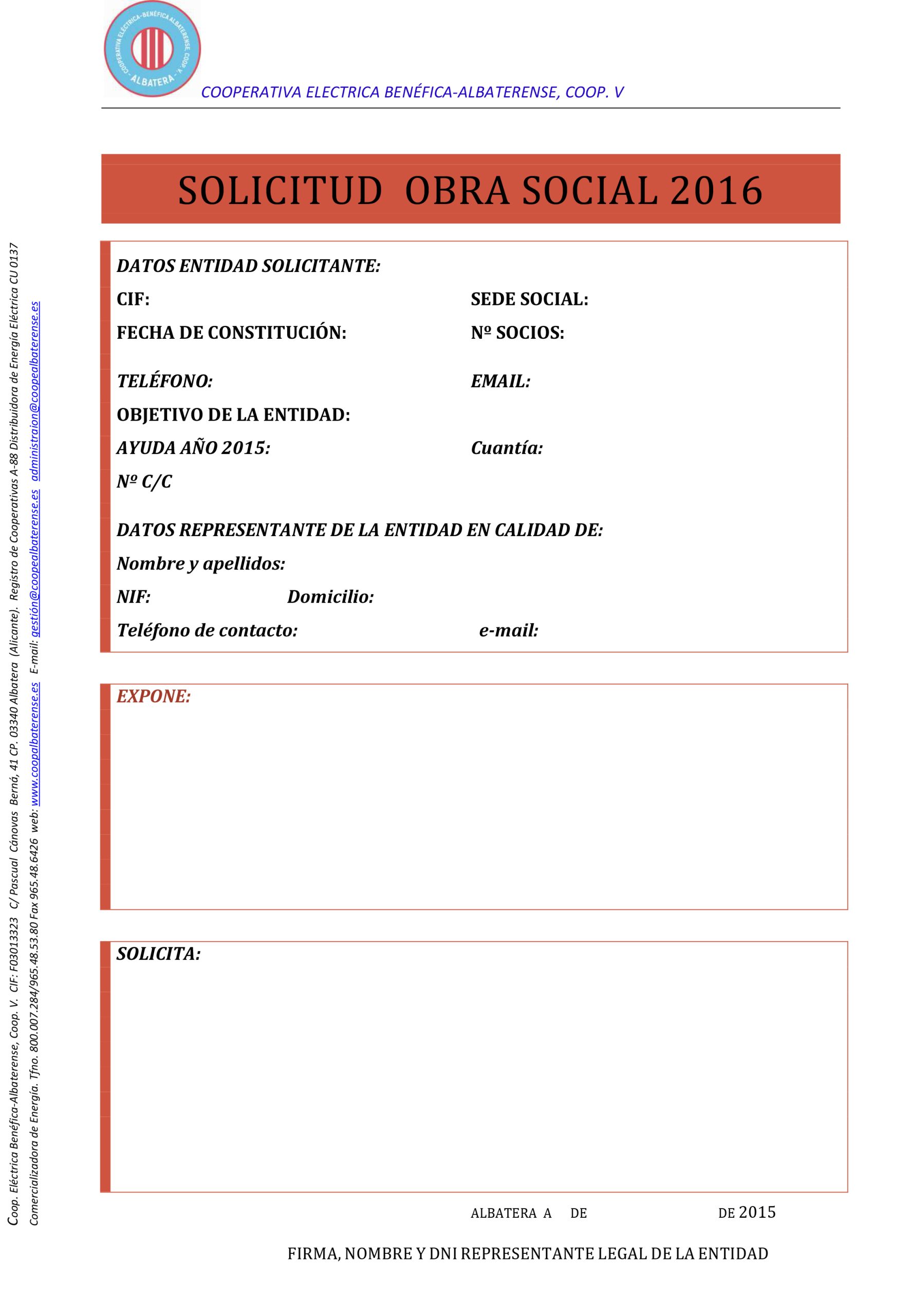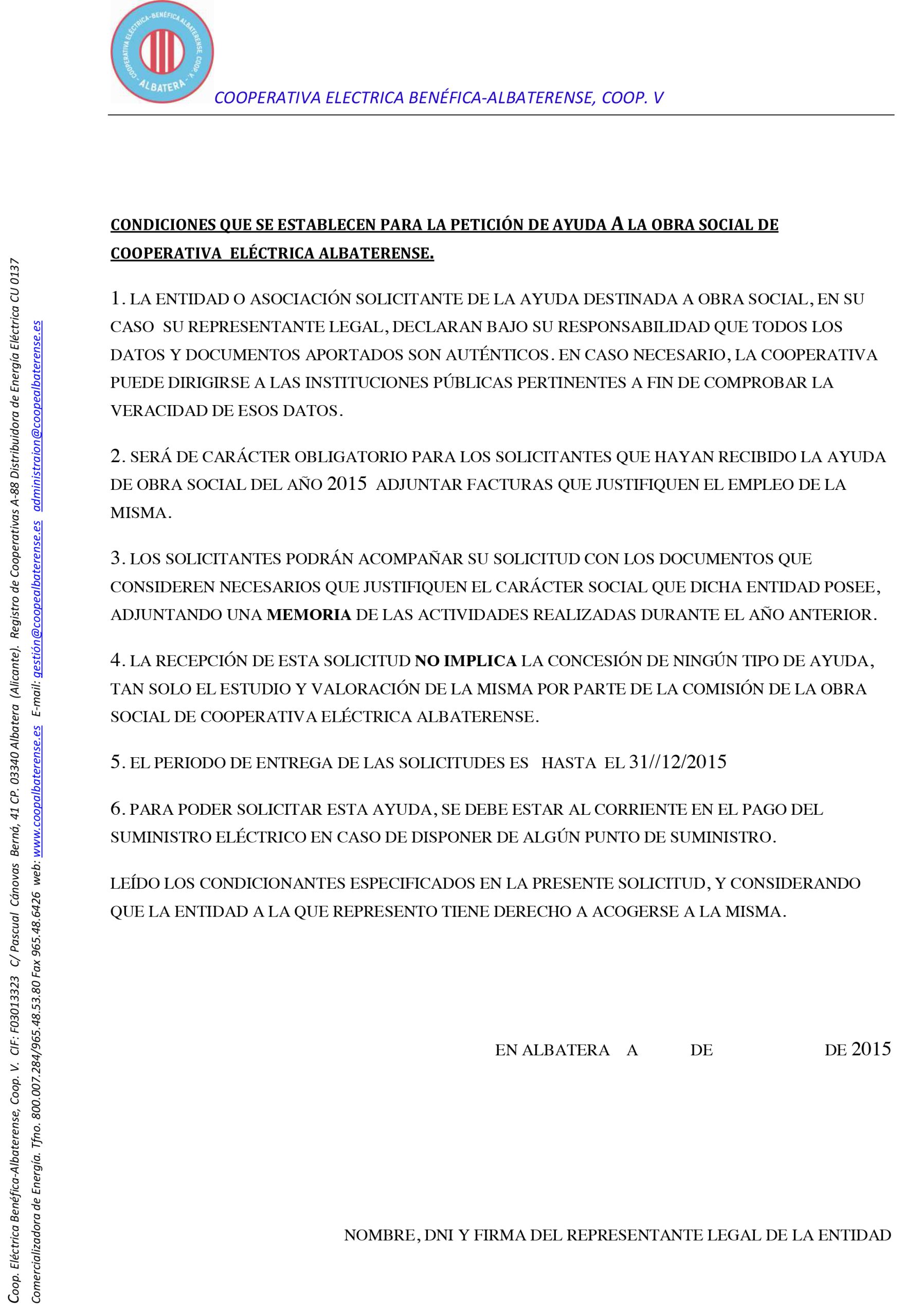 Hasta el 31 de diciembre de 2015 aquellas asociaciones o colectivos que quieran disfrutar de las ayudas de la Obra Social de la Cooperativa Eléctrica Albaterense para el año 2016, deberán cumplimentar su solicitud y entregarla en las oficinas de la Calle Pascual Cánovas nº 41.